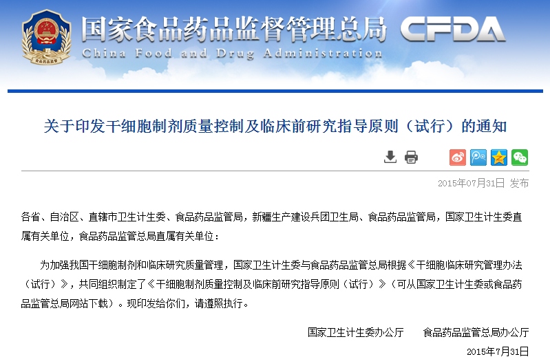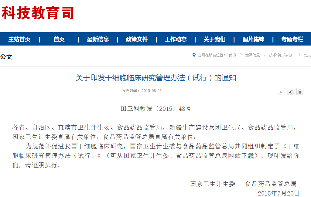 各省、自治區(qū)、直轄市衛(wèi)生計(jì)生委、食品藥品監(jiān)管局,新疆生產(chǎn)建設(shè)兵團(tuán)衛(wèi)生局、食品藥品監(jiān)管局,國(guó)家衛(wèi)生計(jì)生委直屬有關(guān)單位,食品藥品監(jiān)管總局直屬有關(guān)單位:為加強(qiáng)我國(guó)干細(xì)胞制劑和臨床研究質(zhì)量管理,國(guó)家衛(wèi)生計(jì)生委與食品藥品監(jiān)管總局根據(jù)《干細(xì)胞臨床研究管…